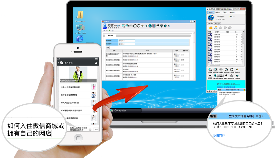 陌客mokor在微信商城中,只要訪客在公眾號(hào)中輸入信息,即可在陌客客戶端軟件即時(shí)提醒,可以快速回復(fù),回復(fù)直接在公眾號(hào)中顯示。這樣,公眾號(hào)可以即時(shí)與陌客端即時(shí)對(duì)話交流。